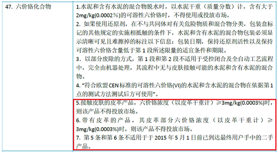 2015年5月1日,欧盟委员会全面实施REACH法规附件XVII关于六价铬的限制要求,将进口皮革制品六价铬(Ⅵ)含量限制在3ppm,即0.0003%。此前,欧盟国家中只有德国对服装、表带、包、椅子、沙发、颈袋和皮革玩具实施六价铬含量不超过3ppm的禁令,而其他欧盟成员国对六价铬的要求是控制在1000ppm。