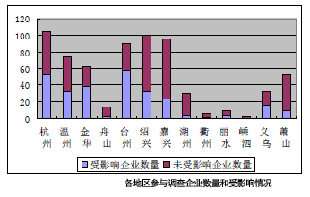 受技贸措施影响的企业所占比例超过或接近全省平均值的依次是台州64.44%、金华61.29%、杭州50.96%、义乌50%以及温州43.24%。