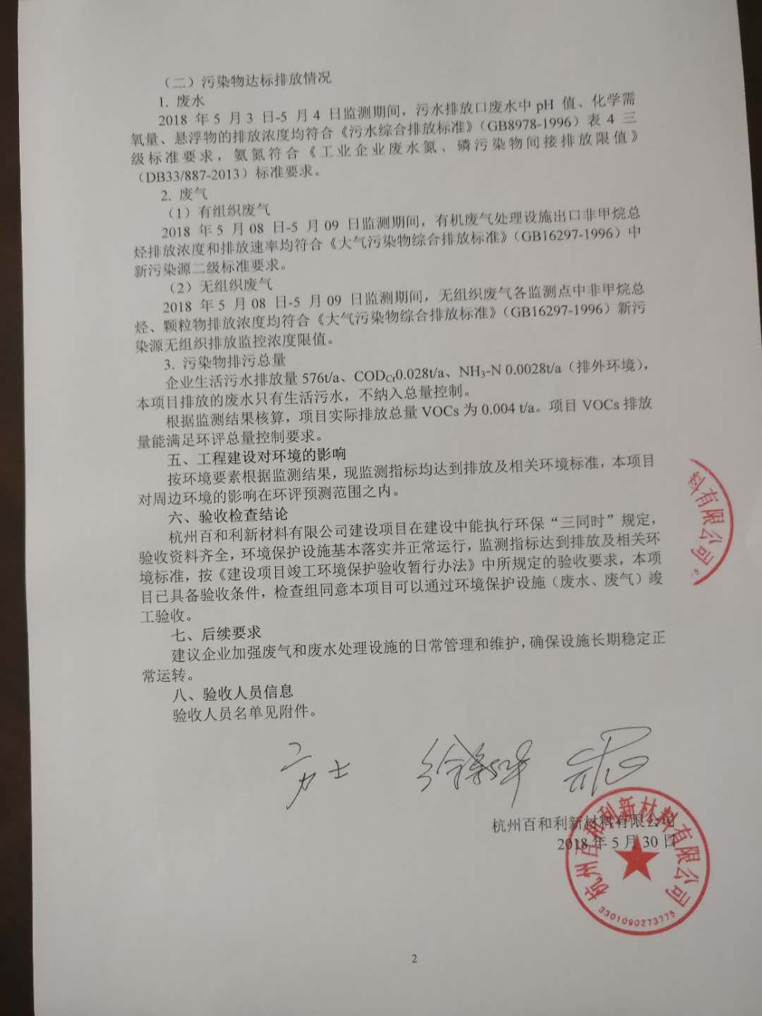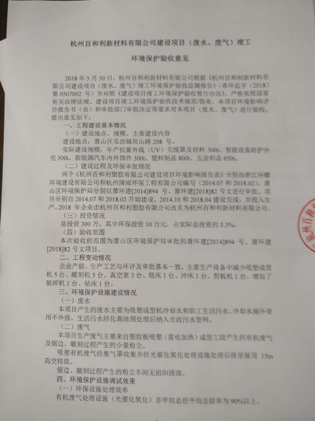 根据《国务院关于修改<建设项目竣工环境保护管理条例>的决定》(国务院令第682号),以及环保部《关于发布<建设项目环境保护验收暂行办法>的公告》(国环规环评[2017]4号),现将《杭州百和利新材料有限公司建设项目竣工验收报告》及验收意见公示如下: