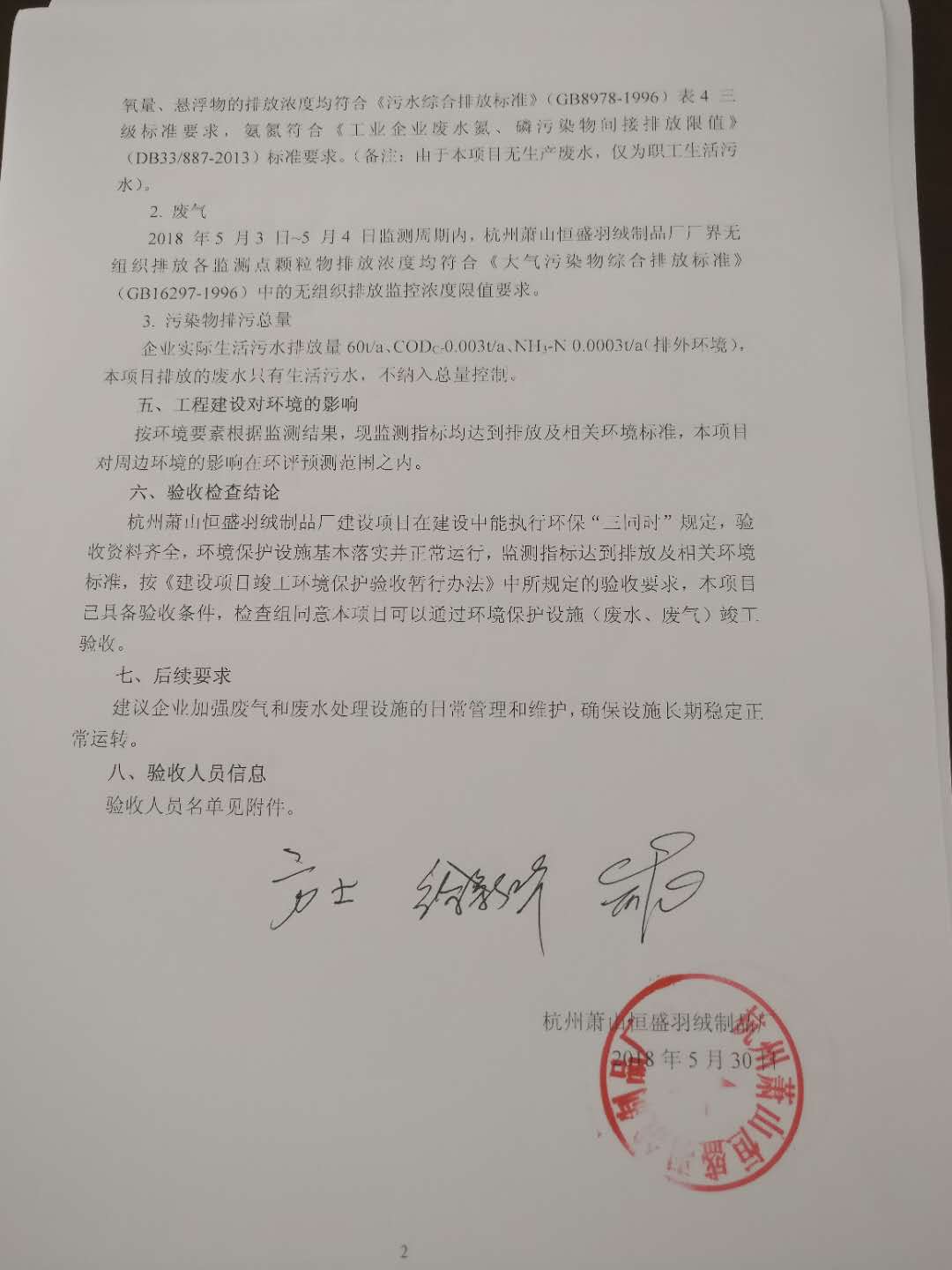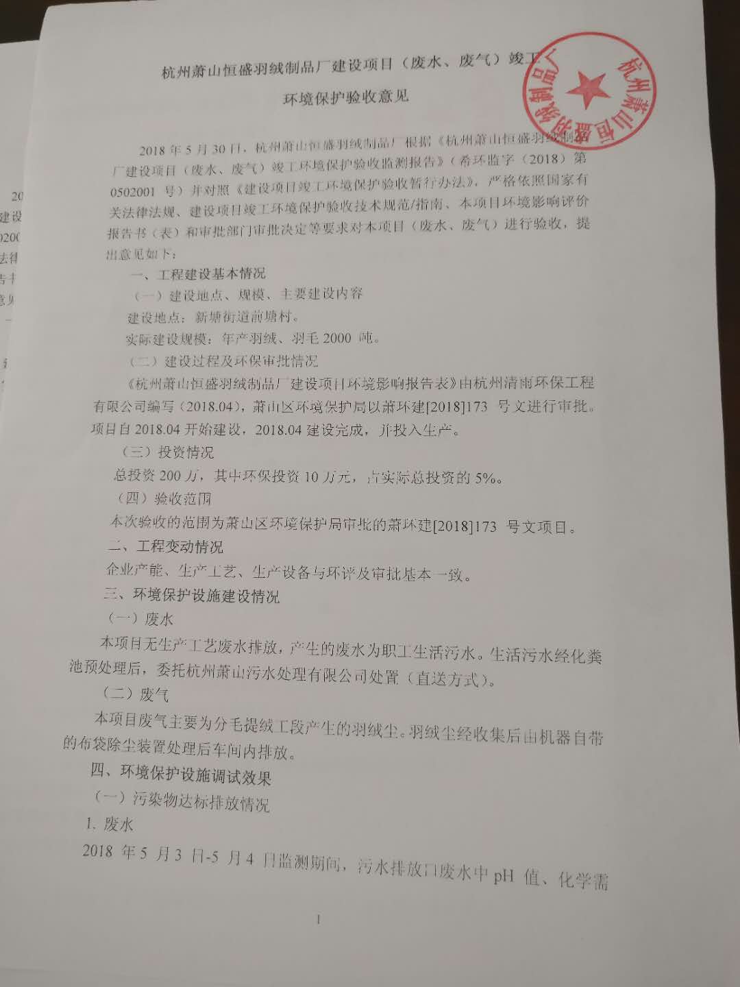 根据《国务院关于修改<建设项目竣工环境保护管理条例>的决定》(国务院令第682号),以及环保部《关于发布<建设项目环境保护验收暂行办法>的公告》(国环规环评[2017]4号,现将《杭州萧山恒盛羽绒制品厂建设项目竣工验收报告》及验收意见公示如下: