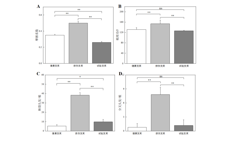 图3 头发物理性质测试结果(图A:摩擦系数,图B:干梳理功,图C:断裂头发数量,图D:分叉头发数量)