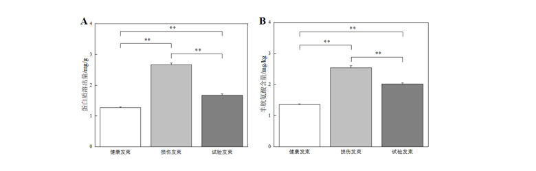 图4 头发化学性质测试结果(图A:蛋白质溶出量,图B:半胱氨酸含量)