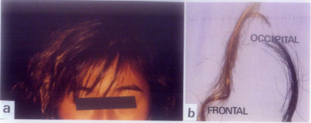 图1 日本女性运动员前额及表层金发(a)。后枕部内侧头发外观正常(b)。(来源:文献1)