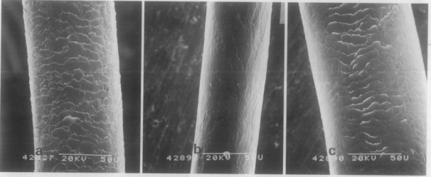 图2 扫描电子显微镜照片。18岁不游泳男性前额黑色毛发(a)。18岁游泳运动员前额金色头发毛鳞片完全脱落(b)。18岁游泳运动员枕部黑色头发的毛鳞片被磨损(c)。
