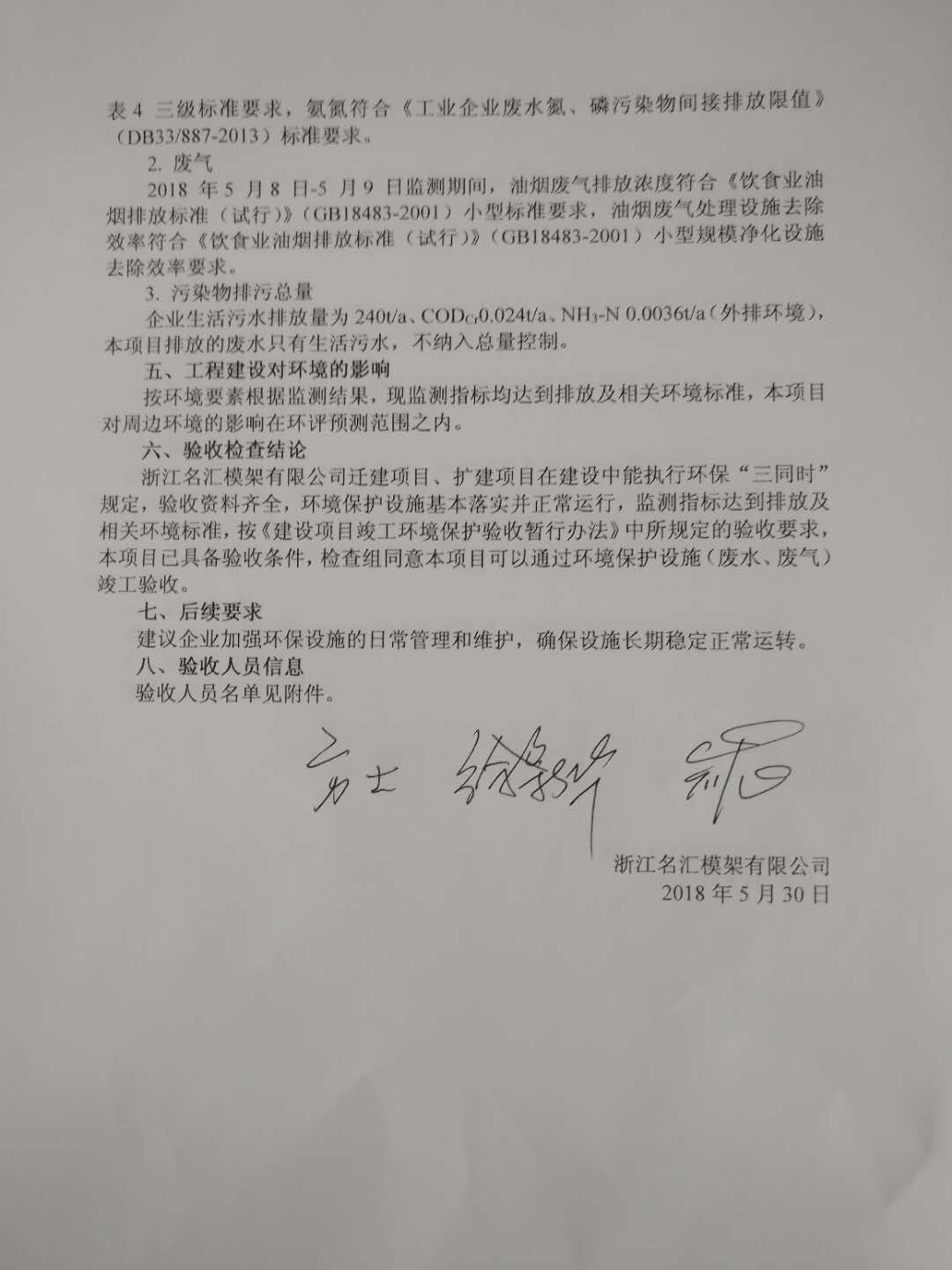 根据《国务院关于修改<建设项目竣工环境保护管理条例>的决定》(国务院令第682号),以及环保部《关于发布<建设项目环境保护验收暂行办法>的公告》(国环规环评[2017]4号),现将《浙江名汇模架有限公司扩建项目竣工验收报告》及验收意见公示如下: