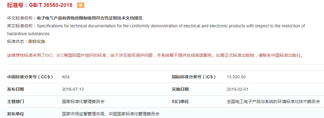 2018年7月13日,中国国家标准化管理委员会发布第10号公告,批准发布了《团体标准化 第2部分:良好行为评价指南》等160项国家标准和3项国家标准外文版的公告。其中包括国家标准GB/T 36560-2018电子电气产品有害物质限制使用符合性证明技术文档规范。该中国RoHS新标准将于2019年2月1日正式实施。
