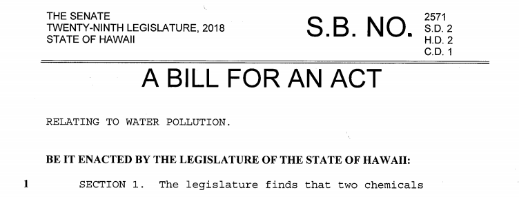 2018年7月3日,夏威夷州发布SB 2571号法案(现为第104号法案),禁止在夏威夷销售和分销含有二苯酮-3(Oxybenzone)或甲氧基肉桂酸乙基己酯(Octinoxate)两种活性成分的防晒产品。含有这两种物质的面部化妆用品不在该法案禁止范围内。该禁令将于2021年1月1日起生效。