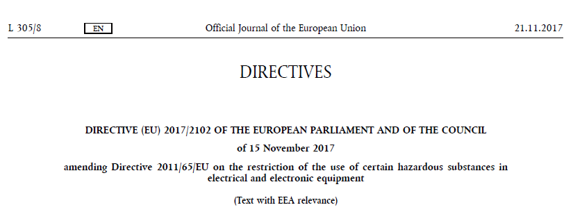 2017年11月21日,《欧盟官方公报》颁布指令(EU)2017/2102,对欧盟RoHS指令2011/65/EU进行修订,主要修改了电子电器及回收利用零部件的使用条件和附件III豁免清单的时效期,该指令自2017年12月11日开始生效。