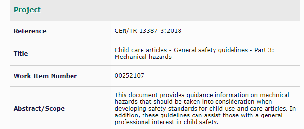 2018年7月4日,欧洲标准化委员会CEN发布技术报告PD CEN/TR 13387-3:2018《儿童用品和儿童护理用品-般安全指南-第3部分:机械风险》,取代之前版本CEN/TR 13387-3:2015。