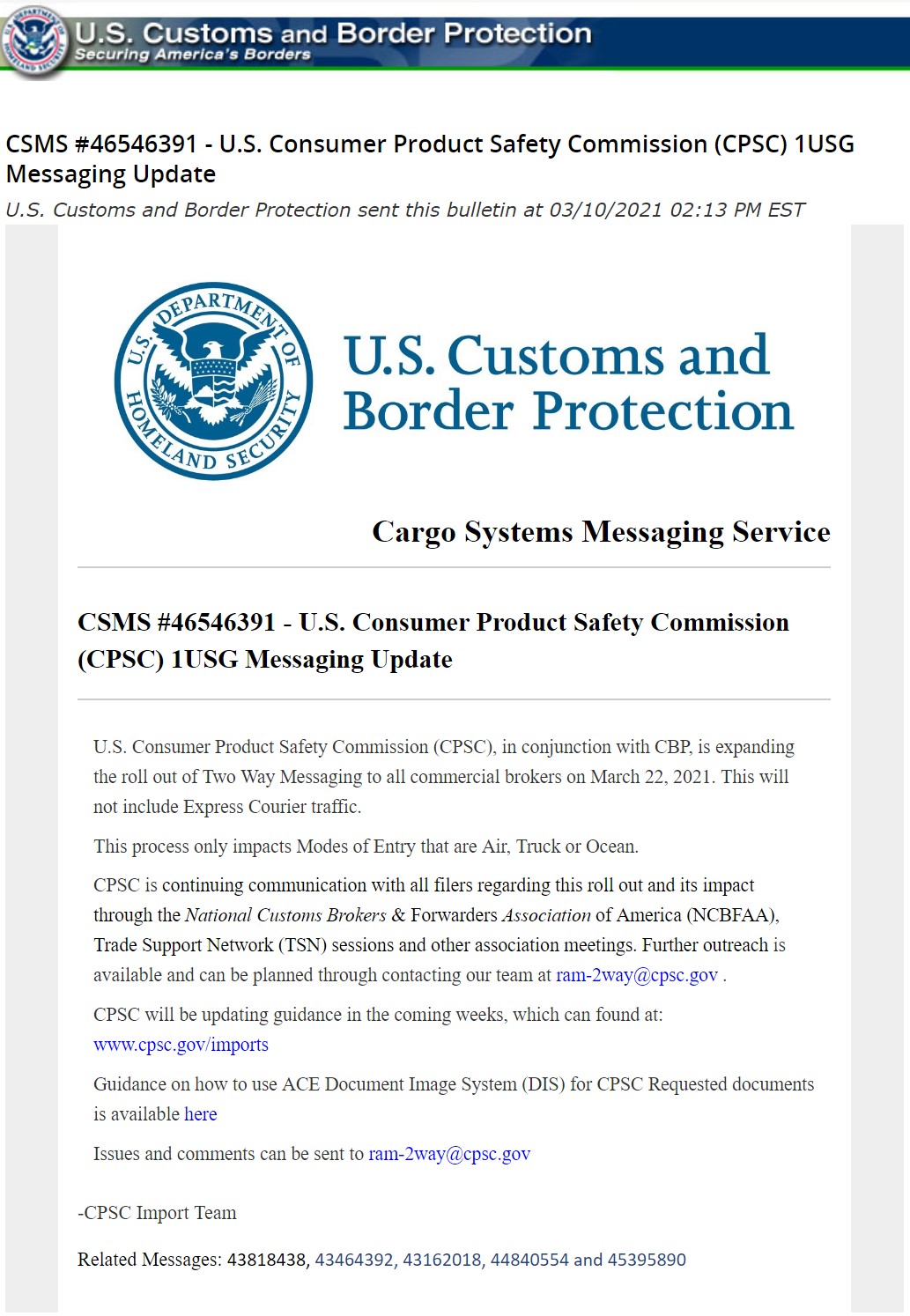 美国CPSC (Consumer Product Safety Commission)与CBP (Customs and Border Protection) 从3月22日开始改革,将全面开展” Two Way Messaging”,凡是他们管辖范围内的产品,都会被标记审查。