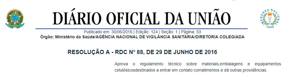 30 June 2018, Brazil regulation of RDC No. 88, RDC No. 89, and RDC No. 90 on technical requirements for food contact cellulosic materials and containers came into force.
