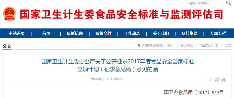 September 28, 2017, China National Health and Family Planning Commission requested public comments on project plan of 2017 national food safety standard (Consultation Paper).The deadline for consultation is October 15, 2017.