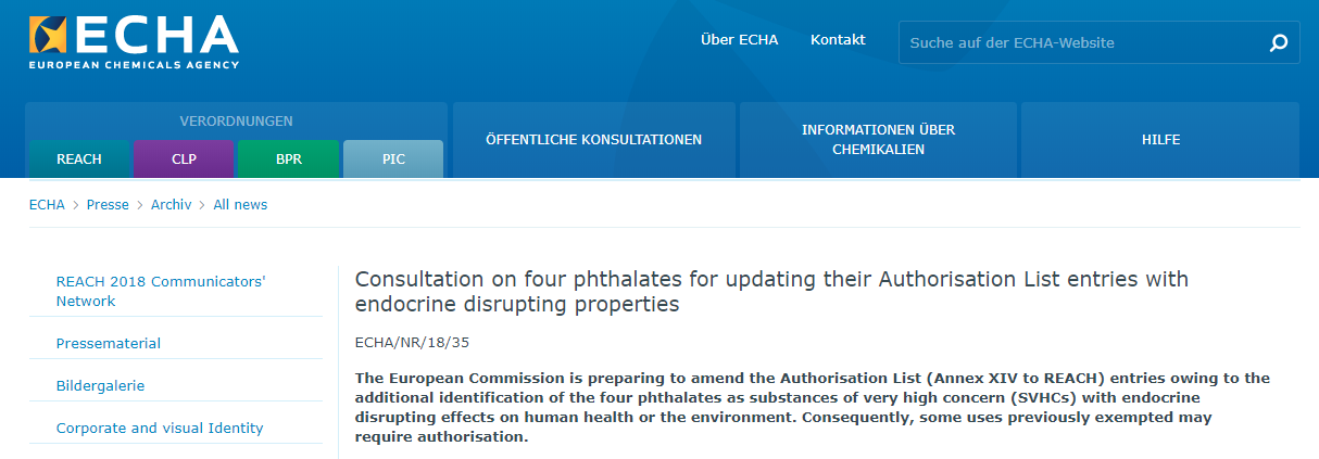 5 June, 2018, the European Chemicals Agency (ECHA) releases a public consultation, preparing to amend the REACH authorization list on the uses of four phthalates.