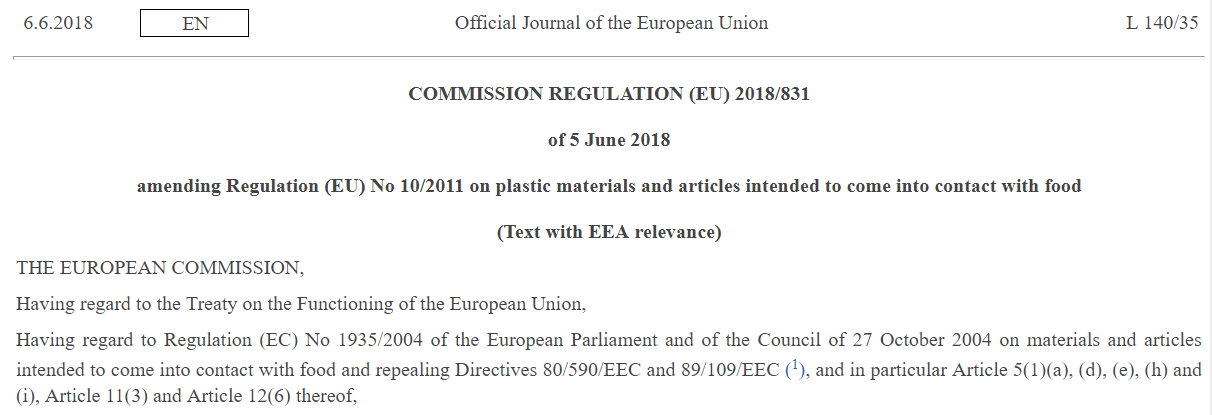 6 June 2018, the Official Journal of EU issues the (EU) 2018/831, amending Regulation (EU) No 10/2011 on plastic materials and articles intended to come into contact with food. The new regulation adds 1,2,3,4-tetrahydronaphtalene-2,6-dicarboxylic acid, dimethyl ester and [3-(2,3-epoxypropoxy)propyl]trimethoxy silane, and also amends the use of Perchloric acid, salts and phosphorous acid, mixed 2,4-bis(1,1- dimethylpropyl)phenyl and 4-(1,1- dimethylpropyl)phenyl triesters. Directive (EU) 2018/831 shall come into force on 26 June 2018.