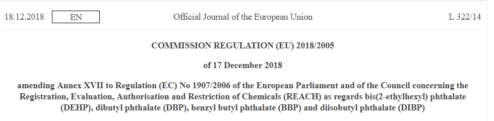 17 December 2018, the Official Journal of European issue the directive (EU) 2018/2005, amended the annex XVII of RAECH regulation. This Directive shall be binding in its entirety and directly applicable in all Member States, and will enter into force on 7 January 2019.
