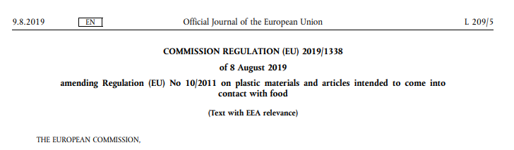 9 August 2019, the Official Journal of the European Union released a directive (EU) 2019/1338 to amend the regulation (EU) 10/2011 on Food Contact Plastic Materials and Articles. This directive shall take into effect on 29 August 2019.