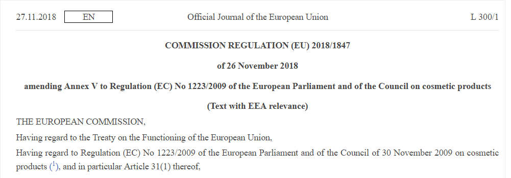 27 November, 2018, the Official Journal of the European Union released a directive (EU) 2018/1847 to amend the entry 7 of Annex V to Regulation (EC) No 1223/2009 of the cosmetics products. This directive shall come into force on 16 December, 2018.