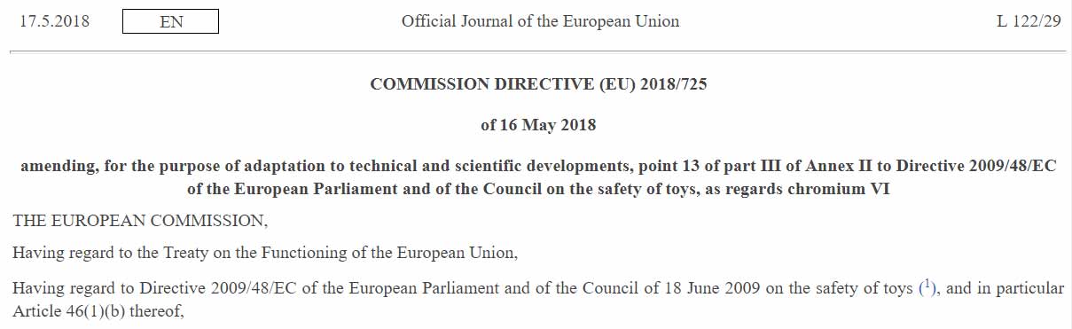 17 May, 2018, the Official Journal of European Union publishes directive (EU)2018/725, amending the limit of Chromium VI in point 13 of part III of Annex II to Toy Safety Directive 2009/48/EC.
