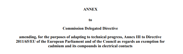 8(b)-I | Cadmium and its compounds in electrical contacts used in: ‒ circuit breakers; ‒ thermal sensing controls; ‒ thermal motor protectors (excluding hermetic thermal motor protectors); ‒ AC switches rated at: • 6 A and more at 250 V AC and more; or • 12 A and more at 125 V AC and more; ‒ DC switches rated at 20 A and more at 18 V DC and more; and ‒ switches for use at voltage supply frequency ≥ 200 Hz. | Applies to categories 1 to 7 and 10 and expires on 21 July 2021." |