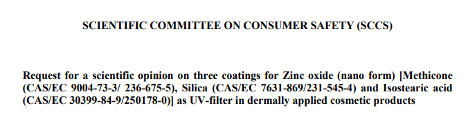 The European Commission has requested an Opinion from its Scientific Committee on Consumer Safety (SCCS) on three zinc oxide coatings for use as UV filters in dermally applied cosmetics. SCCS is to deliver the Opinion before March 2020.