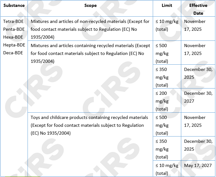 PBDEs, known for their persistence, bioaccumulation potential, and toxicity, were listed for elimination under the Stockholm Convention as early as 2009. Despite gradual phase-out in EU production, PBDEs continue to enter new products (e.g., furniture, textiles) through recycled materials. The current regulation permits an unintentional total residual limit of 500 mg/kg for PBDEs in mixtures or articles. On July 24, 2025, the European Commission proposed a revision to significantly tighten concentration limits for brominated flame retardants (PBDEs) and submitted it to the European Parliament and Council for review. The amendment was officially published in the EU Official Journal on October 28, 2025.