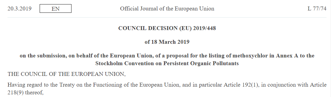 20 March, 2019, the Official Journal of the European Union released the directive (EU) 2019/448, proposing to list the methoxychlor (CAS No: 72-43-5, EC No 200-779-9) in Annex A to the Stockholm Convention on Persistent Organic Pollutants. This Decision shall enter into force on the date of its adoption. The Commission, on behalf of the Union, shall communicate the proposal to the Secretariat of the Convention with all the information required under Annex D to the Convention.