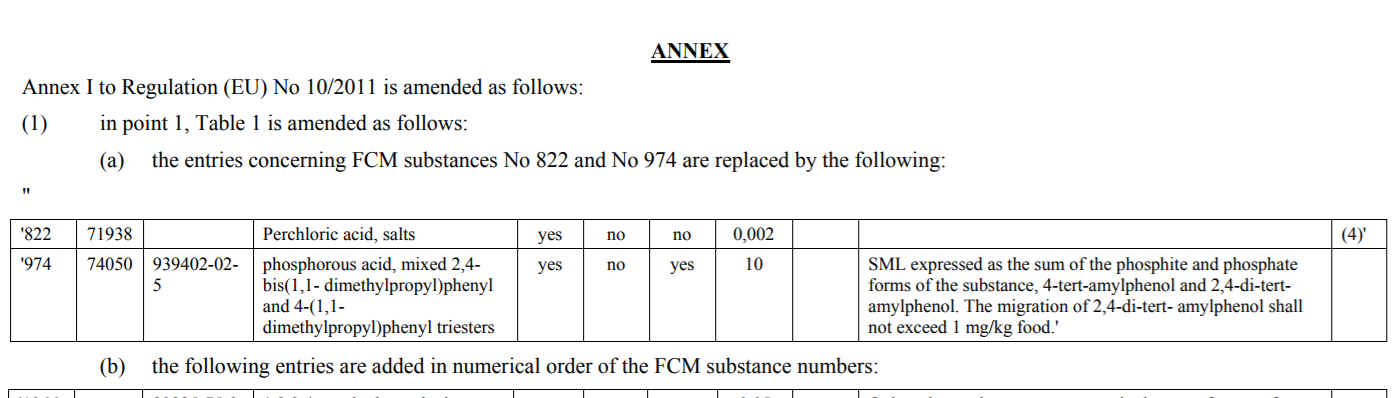 and 4-(1,1- dimethylpropyl)phenyl triesters 939402-02- 5 the SML increases from 5 to 10mg/kg on the basis of new scientific evidence that this substance is not of a safety concern for the consumer. New Authorisation 1,2,3,4-tetrahydronaphtalene- 2,6-dicarboxylic acid, dimethyl Ester 23985-75-3 the migration of the sum of the substance