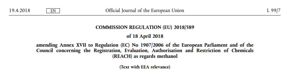 19 April, 2018, the Official Journal of the European Union releases Directive 2018/588 and 2018/589, adding the new entry of 1-methyl-2-pyrrolidone (NMP) and Methanol in the Annex XVII of REACH Regulation.