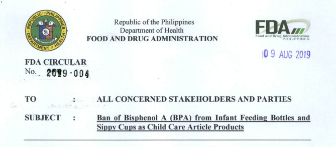 9 August 2019, The Philippines' Food and Drug Administration (FDA) released a notice to ban the use of bisphenol A (BPA) in infant feeding bottles and sippy cups and production, import and sale of products containing BPA are prohibited. The notice says the ban will take effect 30 days after its publication in two newspapers of general circulation and its submission to the Office of the National Administrative Register at the University of the Philippines' Law Center.