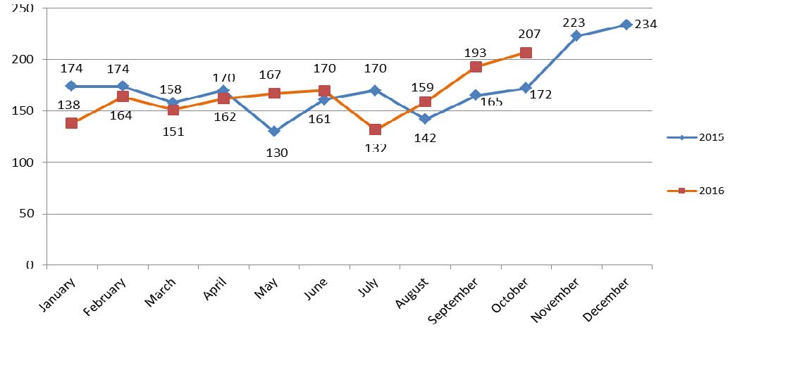 Compared to the total number of notifications on dangerous products submitted during the month of October 2015 (172) the number of notifications was 20% higher in October 2016.