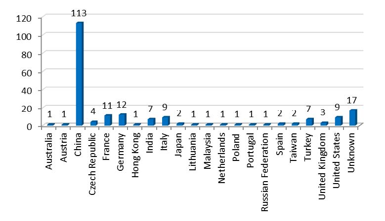 From the dangerous products notified, more than a half originated from China. 46 notifications (22%) concerned products originating from EU Member States. 30 notifications (15%) concerned products originating in other countries. In 17 notifications (8%) the information available did not allow for identification of the country of origin of the notified product.