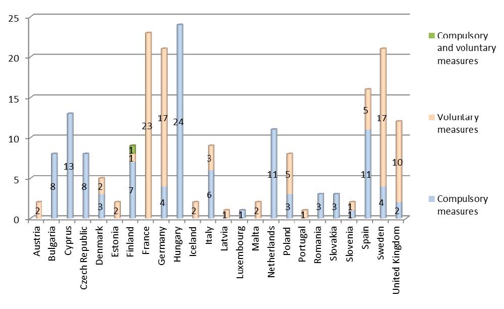 In the month of October, 112 notifications (54%) were of compulsory preventive and restrictive measures ordered by national authorities (‘compulsory measures’). In 94 other notifications (45%), economic operators took preventive and restrictive measures on a ‘voluntary’ basis (‘voluntary measures’), i.e. they complied with their legal obligations without the formal intervention of a national authority. In 1 case, both kinds of measures were applied.