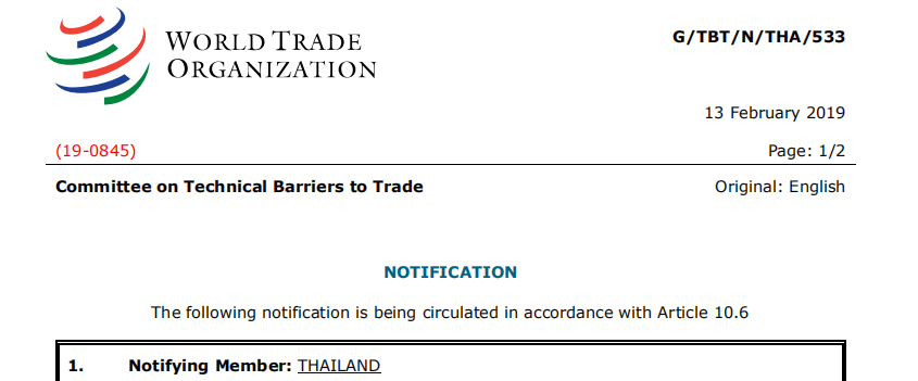 13 February, 2019, WTO released the notice related to the “Draft Thai Industrial Standard for Melamine-formaldehyde, Urea-formaldehyde and Melamine-urea-formaldehyde Utensils for Food: Safety Requirements (TIS 2921-25XX (20XX))”. This draft standard covers food utensils made of thermoset plastic with the polymerization of formaldehyde. It specifies definitions, materials, safety requirements, packaging, marking and labelling, sampling and testing. The final date for comments is April 14, 2019.