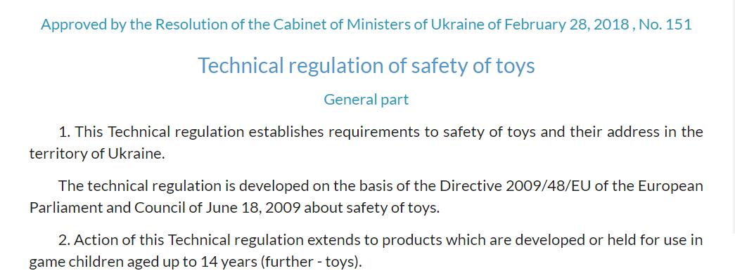 28 February, 2018, Ukraine approved the No.151 standard-the new technical regulation on the safety of toys, which will come into effect on 21 September, 2018.